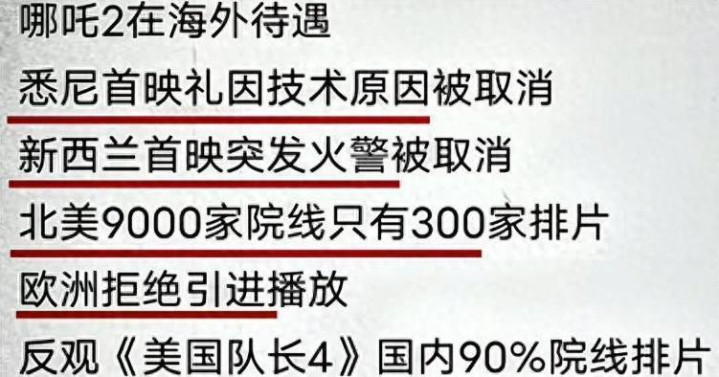 不是影院出啥技术故障,就是突发状况让影片取消了,还有各种理由来拒绝引进。结果一到《美国队长4》,就没发生啥意外,首映的排片都很顺利,难道是哪吒在国外不适应?
