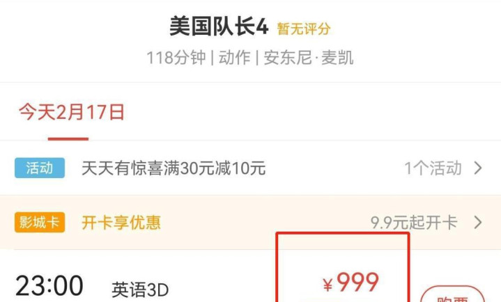 直接点的,有些电影干脆把票价标得离谱,“不要一千块,只要999!”消费者对这种天价票价当然非常不满,谁能想到影院的工作人员竟然说“票价标错了,但现在无法修改”呢。这可以理解为“你要看就得认了”。